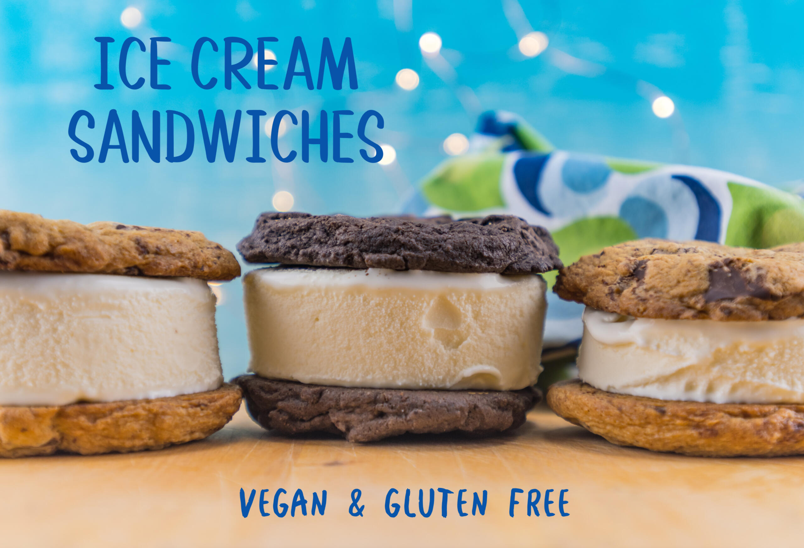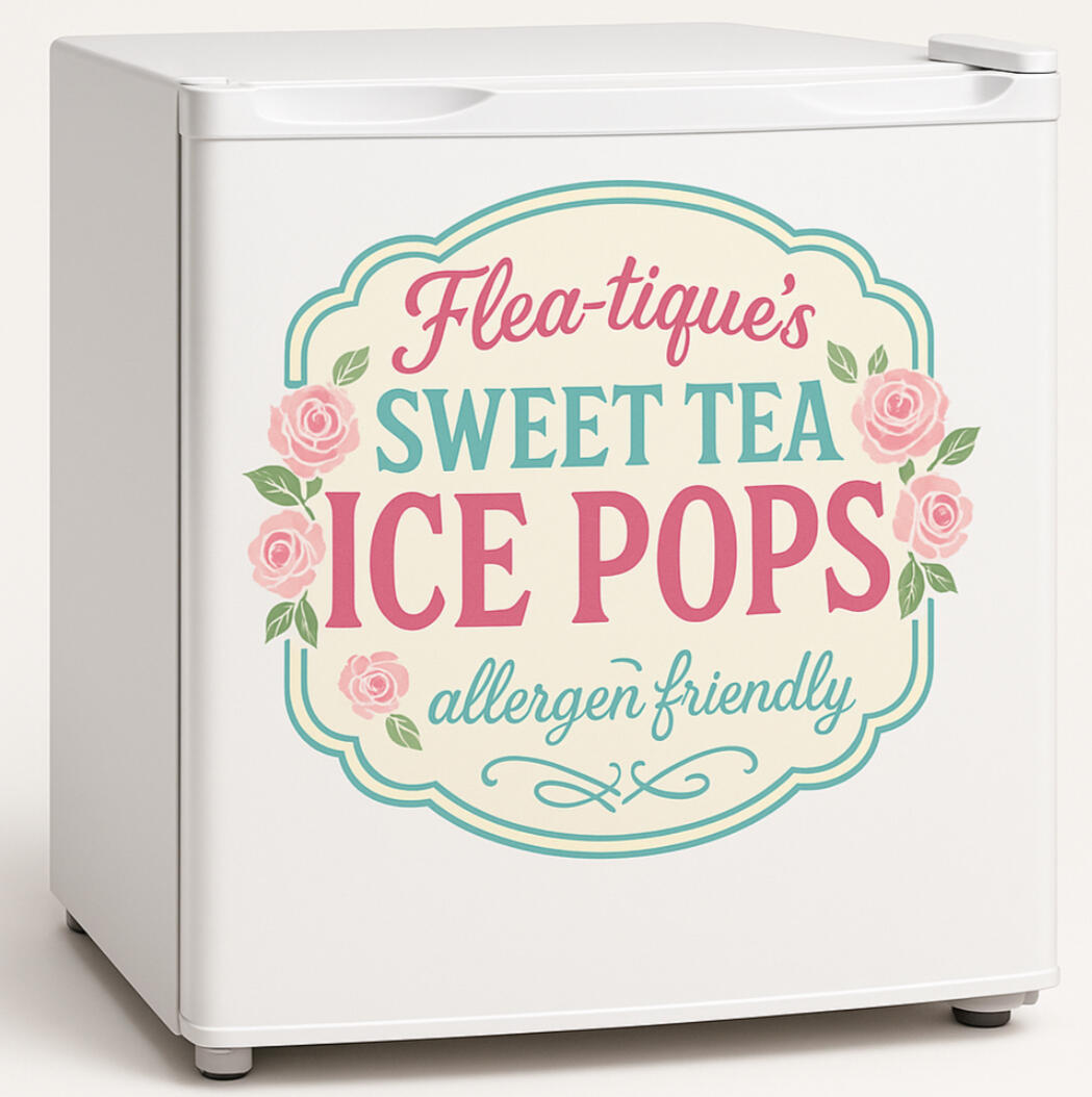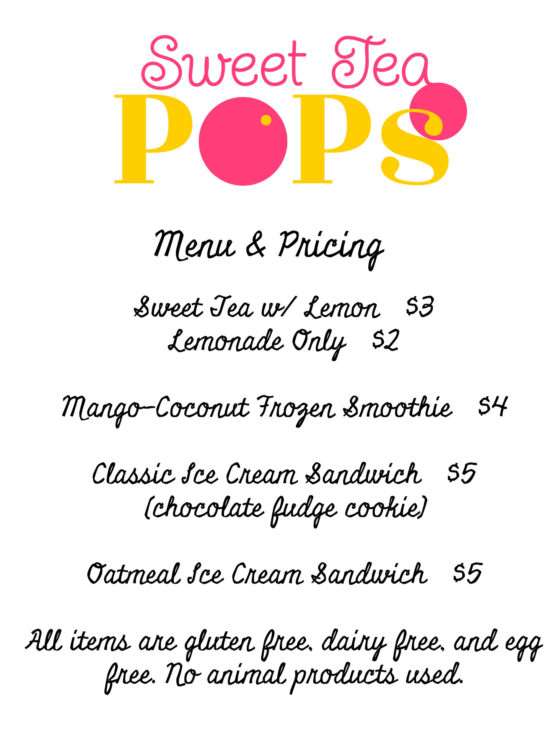 Sweet Tea Ice Pops - freshly brewed tea, fresh squeezed lemon juice, vegan friendly cane sugar, and filtered waterIce Cream Sandwiches - gluten free vegan cookie surrounding dairy free/vegan vanilla ice cream(Cookies available in chocolate and oatmeal raisin)More ideas coming soon - frozen kombucha pops, smoothie pops, protein pops