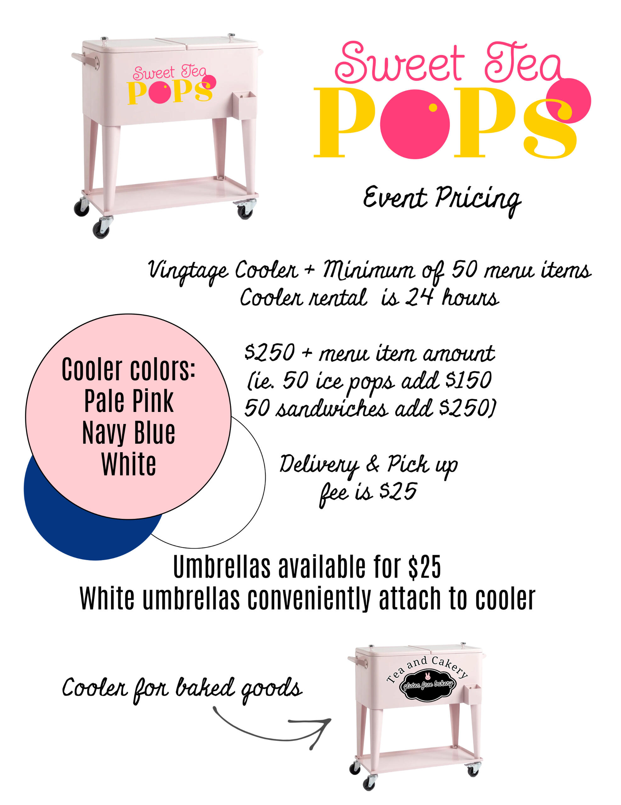 To order just click the Contact button and send us a message. We will reply ASAP and get your order or quote going.We also have a party delivery option where you choose a minimum of 50 sweet treats from our menu and we will deliver in a vintage style cooler containing dry ice which keeps your items frozen for up to 6 hours approximately. Click Rentals for more details.Our latest adventure is supplying retail locations with mini freezers (including a private label option) that we restock weekly with ice pops and sandwiches. Contact Sarah for more details on this exciting new opportunity to provide a cold snack to your customers.